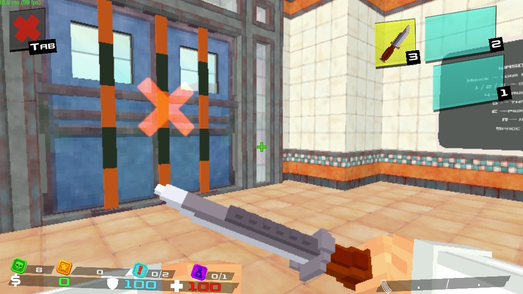 - Block-style first-person shooter with vintage pixelated visuals.